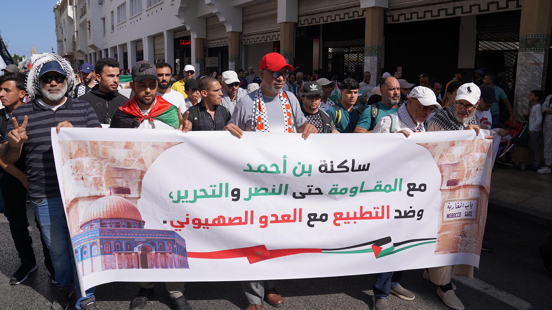 ورفع المشاركون من مختلف الأقاليم لافتات تؤكد الوقوف إلى جانب المقاومة حتى النصر والتحرير، وتطالب بإغلاق مكتب الاتصال بالرباط، وإنهاء لجنة الصداقة المغربية الإسرائيلية بمجلس النواب، وإسقاط التطبيع في كل المجالات والميادين.