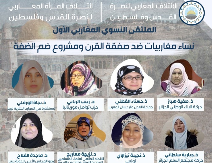 ينظم كل من الائتلاف المغاربي لنصرة القدس وفلسطين وائتلاف المرأة المغاربي لنصرة القدس وفلسطين، الملتقى النسوي المغاربي الأول تحت شعار :”نساء مغاربيات ضد صفقة القرن ومشروع ضم الضفة”.