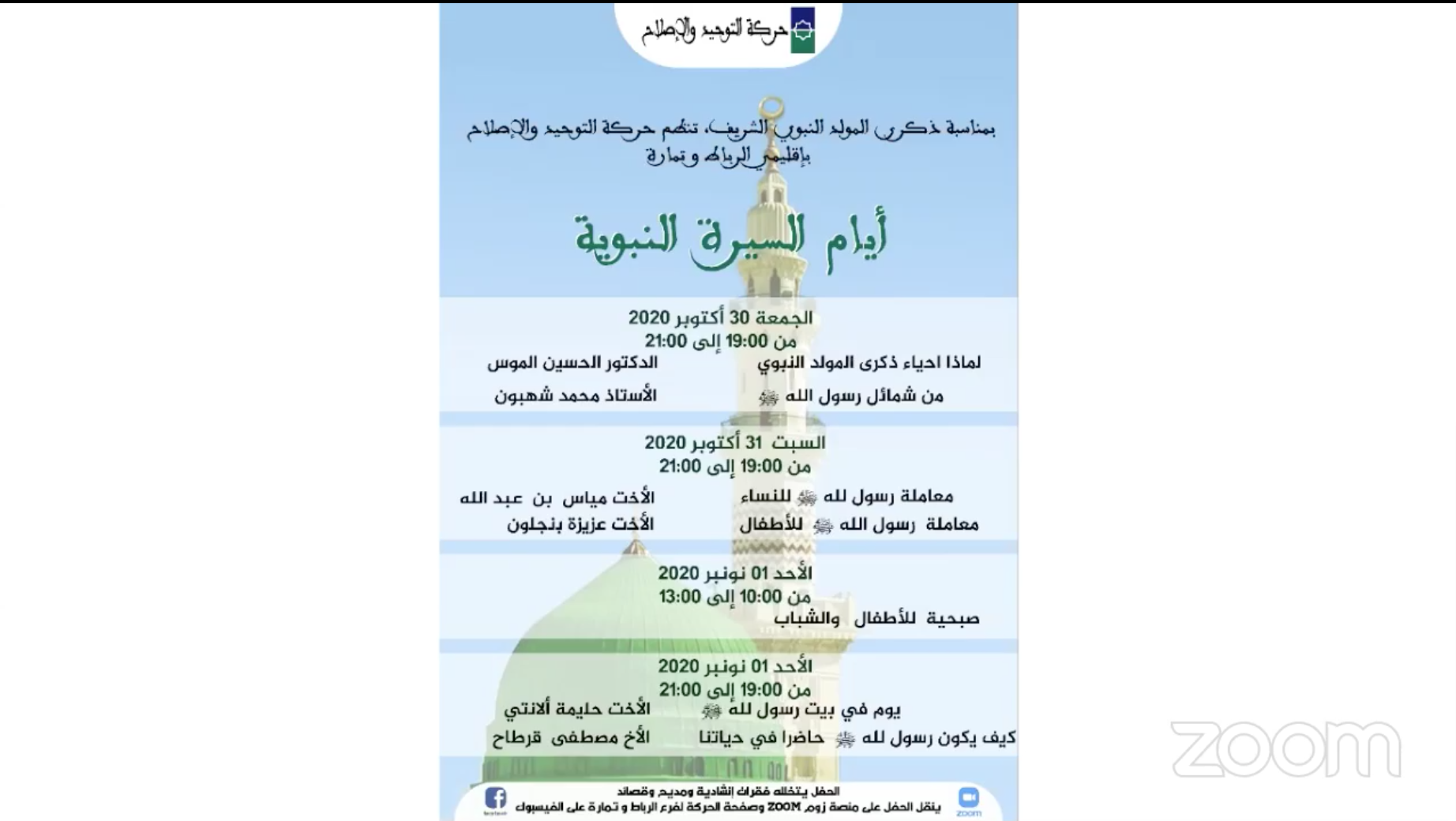 البث المباشر لليوم الثالث من أيام السيرة النبوية التي تنظمها حركة التوحيد والإصلاح بإقليمي الرباط وتمارة بمناسبة ذكرى المولد النبوي الشريف.