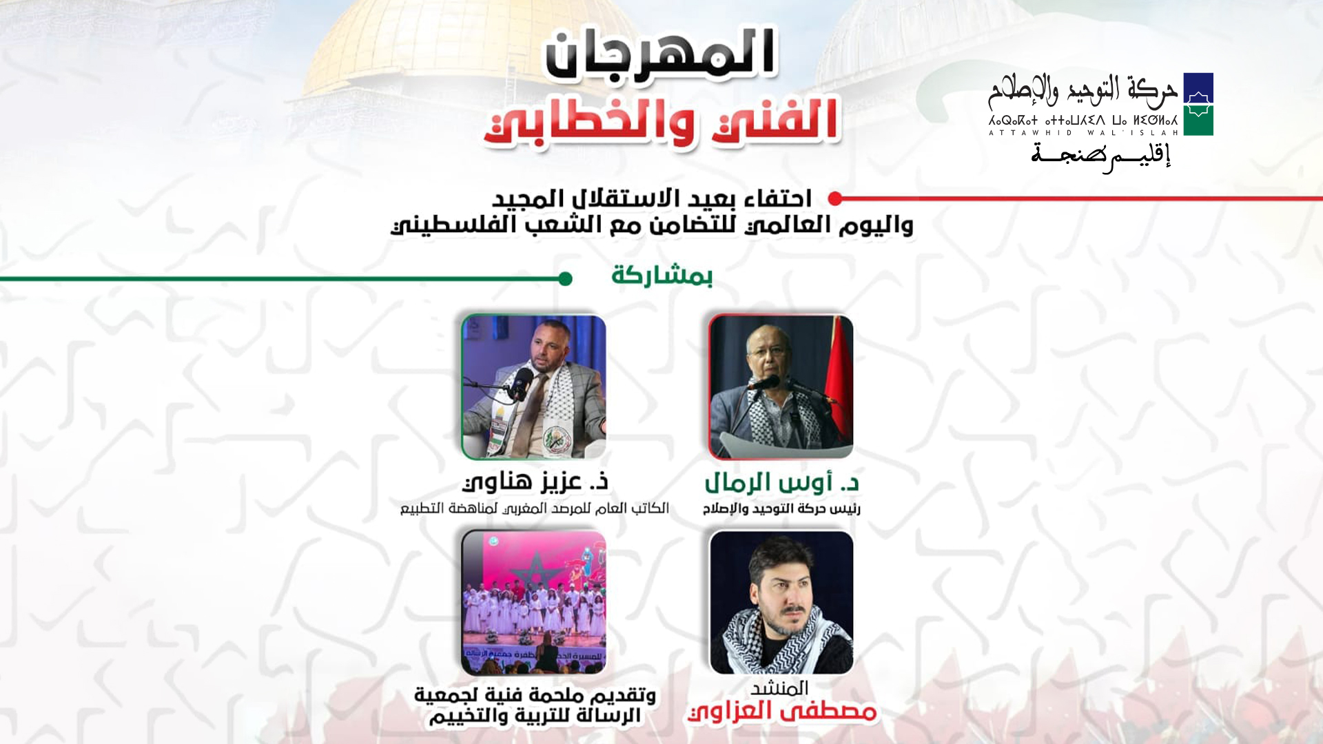 وسيشارك في المهرجان الذي يأتي في إطار الاحتفاء بعيد الاستقلال المجيد واليوم العالمي للتضامن مع الشعب الفلسطيني، كل من الدكتور أوس رمال رئيس حركة التوحيد والإصلاح والأستاذ عزيز هناوي الكاتب العام للمرصد المغربي لمناهضة التطبيع.