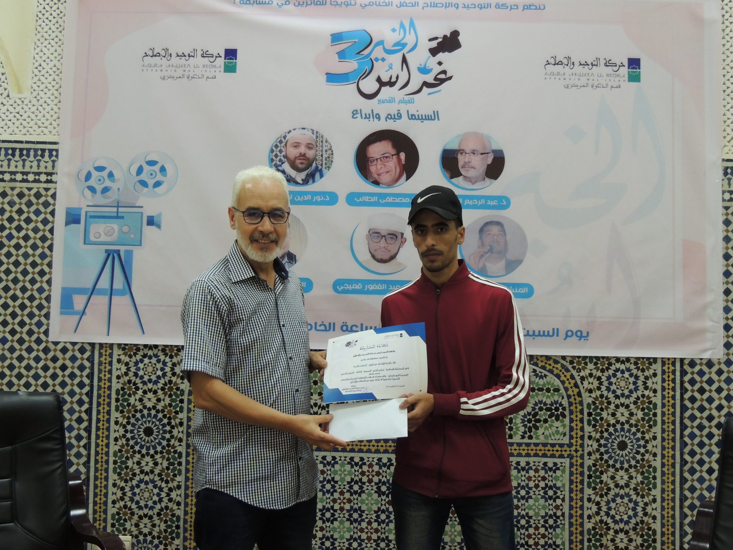 فيما كرم رئيس حركة التوحيد والإصلاح لجنة التحكيم لهذه الدورة والتي تتمثل في كل من الناقد السينمائي رئيس جمعية مغرب الفن الأستاذ مصطفى الطالب ورئيس مؤسسة بيت الثقافة الأستاذ نور الدين الأشهب.نظم قسم الدعوة المركزي لحركة التوحيد والإصلاح مساء اليوم السبت 2 أكتوبر 2021 الحفل الختامي تتويجا للفائزين في مسابقة غراس الخير للفيلم القص