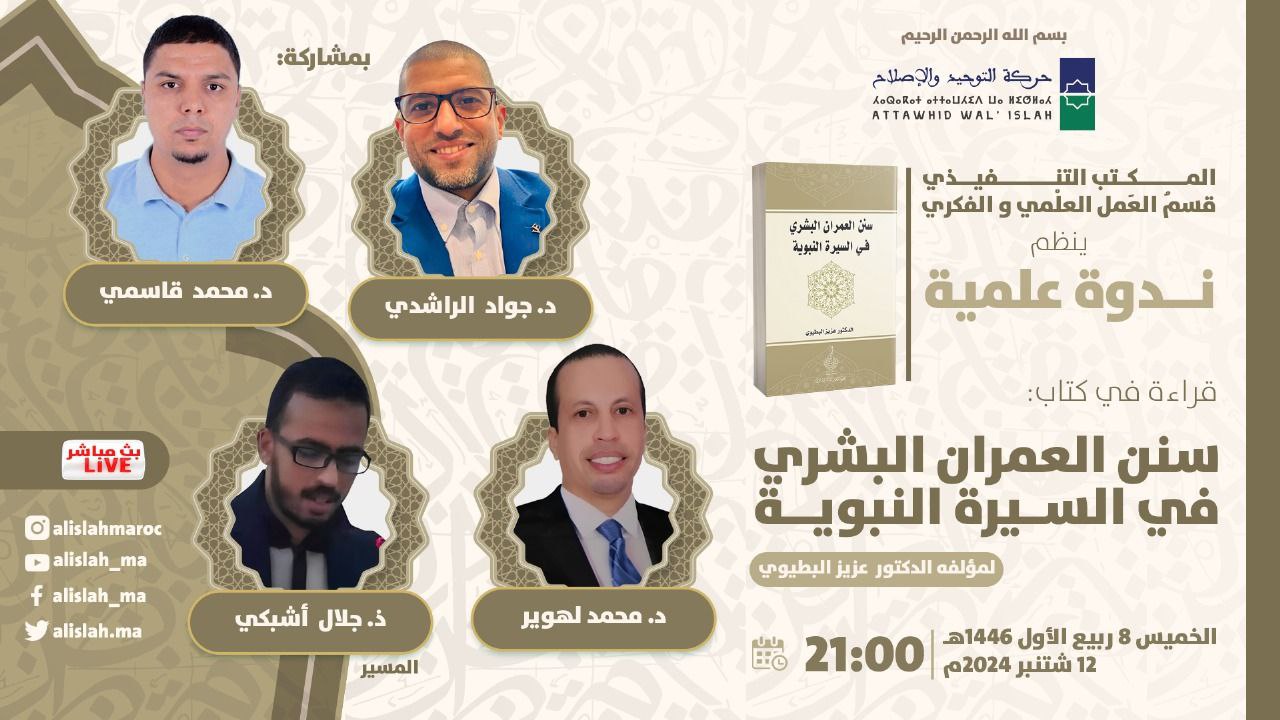 ينظم قسم العمل العلمي والفكري لحركة التوحيد والإصلاح يوم الخميس 12 شتنبر 2024، ندوة علمية حول قراءة في كتاب “سنن العمران البشري في السيرة النبوية” لمؤلفه الدكتور عزيز البطيوي، وستنقل الندوة في بث مباشر على منصة الفيسبوك على الساعة التاسعة مساء (21.00).