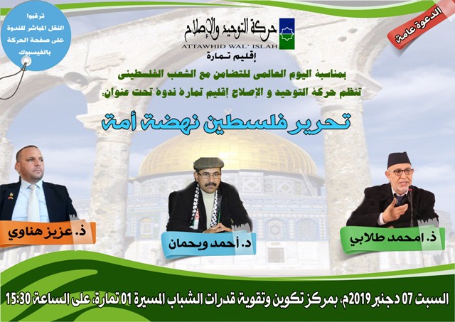 بمناسبة اليوم العالمي للتضامن مع الشعب الفلسطيني، يعتزم فرع الحركة بتمارة تنظيم ندوة في موضوع :”تحرير فلسطين نهضة أمة”.