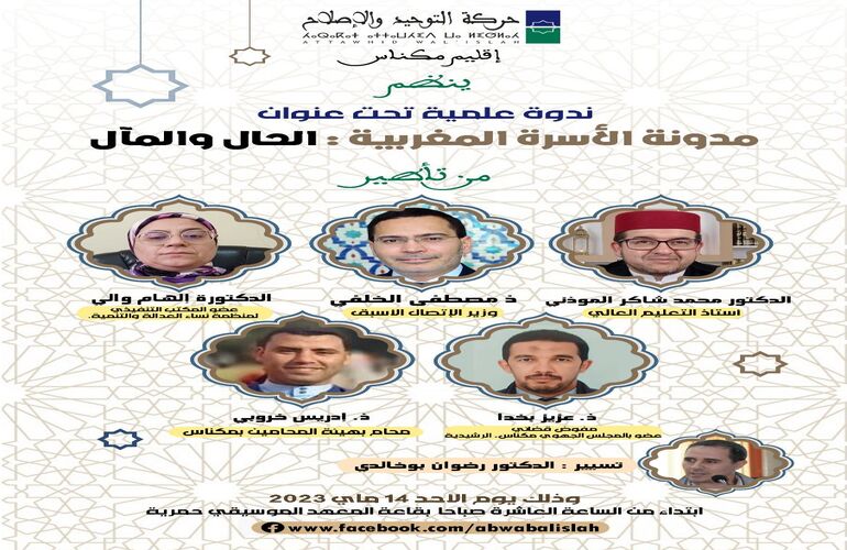 ينظم الفرع الإقليمي لحركة التوحيد والإصلاح بمكناس يوم الأحد 14 ماي 2023  ندوة علمية في موضوع :“مدونة الأسرة المغربية: الحال والمآل”، سيؤطرها على الساعة العاشرة صباحا (10.00) بالمعهد الموسيقي حمريةk كل من الدكتور محمد شاكر المودني، والأستاد مصطفى الخلفي، والدكتورة إلهام والي، والأستاذ عزيز بخدا، والأستاد ادريس خروبي، وسيسيرها الدكتور رضوان بوخالدي.