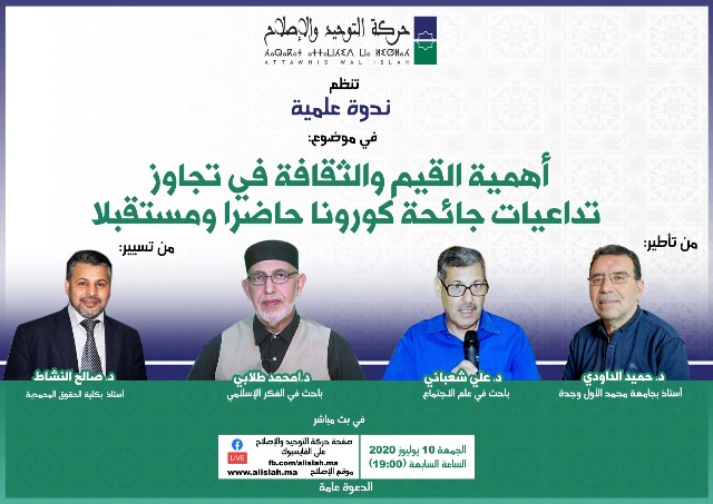 تنظم حركة التوحيد والإصلاح ندوة علمية عن بعد في موضوع :”أهمية القيم والثقافة في تجاوز تداعيات جائحة كورونا حاضرا ومستقبلا”.