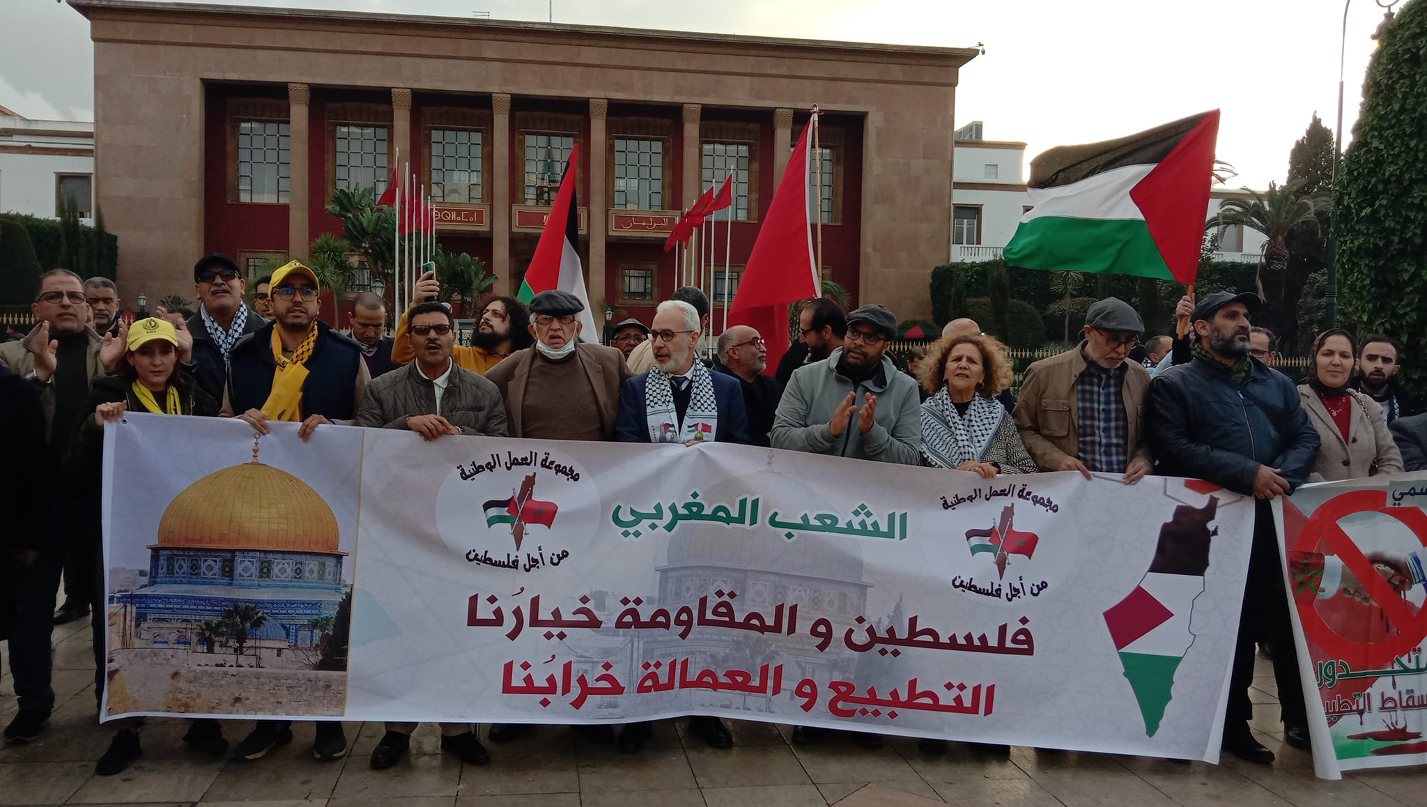 الوقفة التي دعت لها مجموعة العمل الوطنية لأجل فلسطينية والجبهة المغربية لدعم فلسطين وضد التطبيع، عرفت رفع شعارات معبرة عن تمسك المغاربة بالقضية الفلسطينية ودعمهم للمقاومة واستنكارهم وتنديدهم بالتطبيع الذي نهجته الدولة في عدة مجالات مع الكيان الغاصب المحتل لفلسطين.