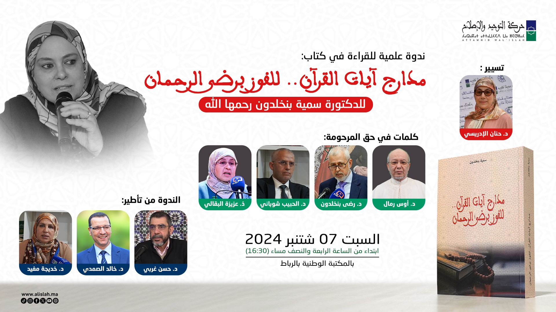 تنظم حركة التوحيد والإصلاح ندوة علمية للقراءة في كتاب “مدارج آيات القرآن للفوز برضى الرحمان” للدكتورة سمية بنخلدون رحمها الله، وذلك يوم السبت 7 شتنبر 2024 على الساعة الرابعة والنصف عصرا (16.30) بالمكتبة الوطنية بالرباط.