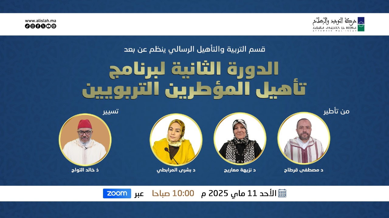 ينظم قسم التربية والتأهيل الرسالي لحركة التوحيد والإصلاح يوم الأحد 11 ماي 2025  الدورة الثانية لبرنامج تأهيل المؤطرين التربويين.