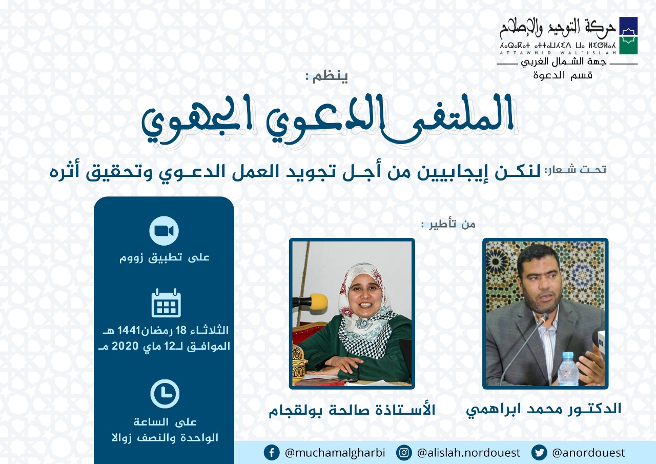 ينظم قسم الدعوة لحركة التوحيد والإصلاح بجهة الشمال الغربي الملتقى الدعوي الجهوي، بشعار”لنكن إيجابيين من أجل تجويد العمل الدعوي وتحقيق أثره”،وذلك يوم الثلاثاء 18 رمضان 1441ه الموافق لـ 12 ماي 2020م عبر برنامج تطبيق التواصل عن بعد زووم ابتداء من الواحدة والنصف زوالا.