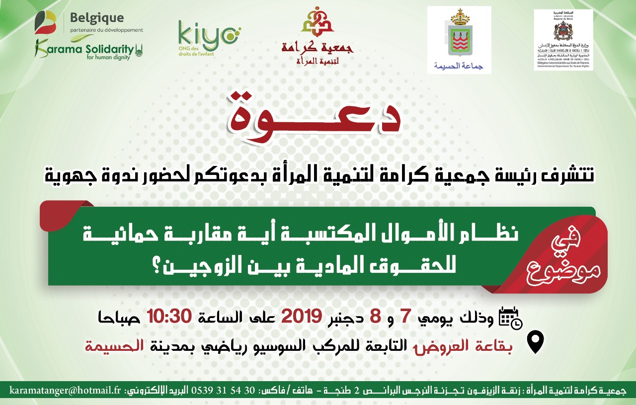 تنظم جمعية كرامة لتنمية المرأة ندوة جهوية في موضوع “نظام الأموال المكتسبة أية مقاربة حمائية للحقوق المادية بين الزوجين؟” وذلك يومي السبت والأحد 7و8 دجنبر 2019 على الساعة العاشرة والنصف صباحا (10:30) بقاعة العروض التابعة للمركب السوسيو رياضي بمدينة الحسيمة.