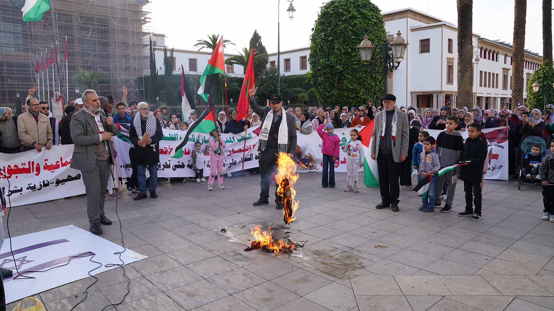 ورفع المتظاهرون شعارات منددة بجرائم العدو الإسرائيلي ومعبرة عن دعمهم للشعب الفلسطيني والمقاومة ومطالبين الدولة المغربية بإلغاء كل أشكال التطبيع مع الاحتلال الإسرائيلي.