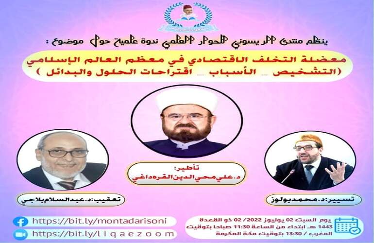 ينظم منتدى الريسوني للحوار العلمي محاضرة بعنوان “معضلة التخلف الاقتصادي في معظم العالم الإسلامي : التشخيص، الأسباب، الحلول والبدائل” من تأطير الدكتور علي محي الدين القره داغي الأمين العام للاتحاد العالمي لعلماء المسلمين، وذلك يوم السبت 2 يوليوز 2022/ 3 ذو الحجة 1443 ابتداء من الساعة الحادية عشر والنصف صباحا (11.30) بتوقيت المغرب – الواحدة والنصف بتوقيت مكة المكرمة على منصة زووم” وصفحة منتدى أصدقاء الريسوني للحوار العلمي.