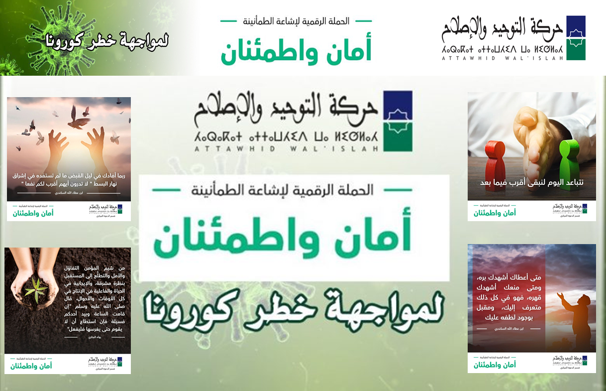 أطلقت حركة التوحيد والإصلاح حملة رقمية لإشاعة الطمأنينة “أمان واطمئنان”. وعرفت الحملة منذ انطلاقتها انخراطا واسعا من قبل عدد من قيادات حركة التوحيد والإصلاح والباحثين والدعاة في نشرهم عدد من المواد التحسيسية للتوعية بسبل مواجهة خطر تفشي وباء “كورونا” المستجد (كوفيد_19).