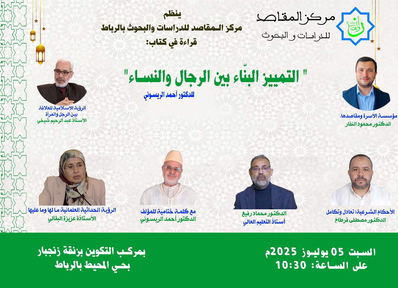 ينظم مركز المقاصد للدراسات والبحوث قراءة في كتاب: “التمييز البناء بين الرجال والنساء” لمؤلفه العلامة أحمد الريسوني، يوم السبت 5 يوليوز 2025 بمركز التكوين بحي المحيط في الرباط ابتداء من الساعة 10:30 صباحا.