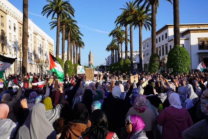 وهتف المتضامنون بشعارات من قبل “الشعب يريد إسقاط التطبيع”، و”الشعب يريد تحرير فلسطين”، و”كلنا فداء فداء لغزة الصامدة”، حاملين الأعلام المغربية والفلسطينية ولافتات تدعو إلى إنهاء المعاناة التي يعيشها الشعب الفلسطيني في كل أراضيه.