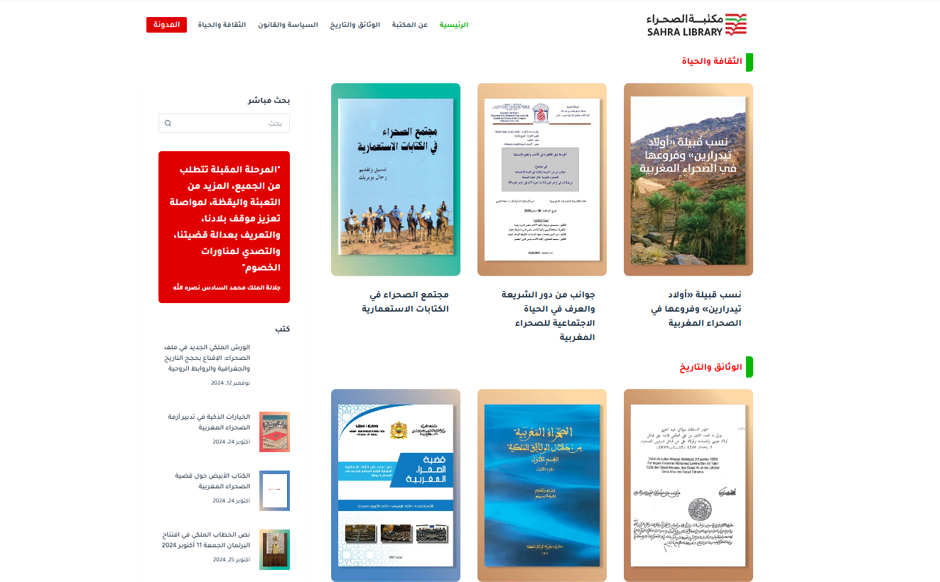أعلنت إدارة “مكتبة الصحراء” عن إطلاق موقعها الإلكتروني sahralibrary.com الذي يشكل منصة متكاملة ومجانية توفر مصادر معرفية شاملة حول الصحراء المغربية.