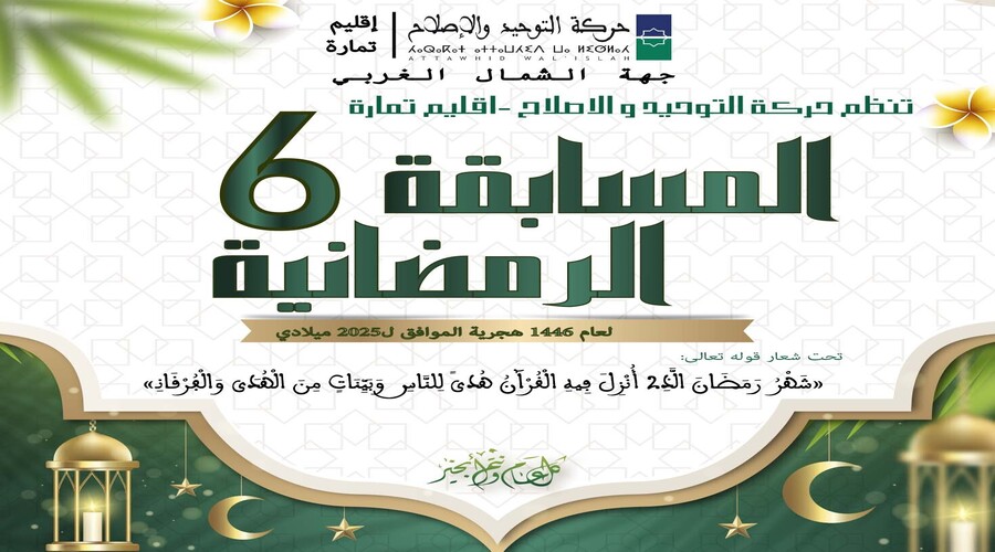 ينظم إقليم تمارة لحركة التوحيد والإصلاح بمناسبة حلول شهر رمضان الأبرك المسابقة  الرمضانية السادسة 1446 هـ. وتهدف إلى ربط الناس بالقران الكريم والسنة النبوية وإعانتهم على فهم وتدبر معانيهما، وكذا مدارسة السيرة العطرة واستخلاص الدروس والعبر منها.