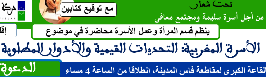 ينظم قسم المرأة وعمل الأسرة بالفرع الإقليمي بفاس، محاضرة في موضوع:”الأسرة المغربية : التحديات القيمية والأدوار المطلوبة”، ستؤطرها الدكتورة حنان الإدريسي نائب رئيس الحركة.