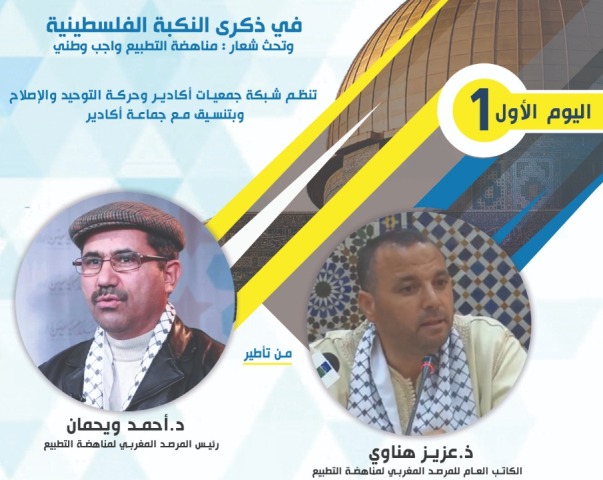 بمناسبة الذكرى 72 ليوم النكبة الفلسطيني وتحت شعار” مناهضة التطبيع واجب وطني”، نظمت حركة التوحيد والإصلاح فرع أكادير وشبكة جمعيات أكادير وبتنسيق مع جماعة أكادير فعاليات الأيام الفلسطينية في نسختها السادسة يومي 18 و19 ماي 2020 عبر تقنية التواصل عن بعد كما تم البث المباشر عبر صفحات الفايس بوك.