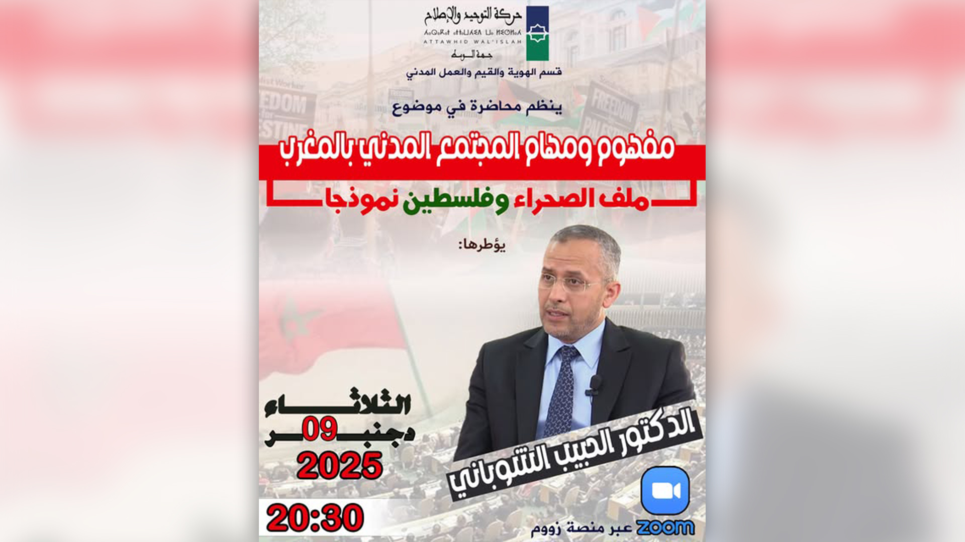 نظم قسم الهوية والعمل المدني بجهة الوسط لحركة التوحيد والإصلاح مساء الثلاثاء 09 دجنبر الجاري محاضرة تحت عنوان: “مفهوم ومهام المجتمع المدني بالمغرب ملف الصحراء وقضية فلسطين نموذجا”، استعرض فيها مفهوم المجتمع المدني ومقاربة اللحظة الفارقة، قراءة في تجارب الانتقال السلس نحو أنظمة سيادة القانون عبر أحداث سياسية نوعية ومهام المجتمع المدني.