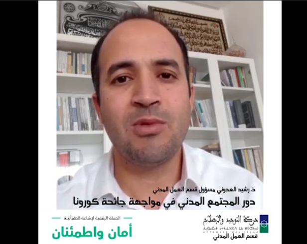 ووجه مسؤول قسم العمل المدني لحركة التوحيد والإصلاح ثلاث رسائل في فيديو توجيهي مرئي نشره موقع “الإصلاح” في إطار حملة “أمان واطمئنان” الرقمية لإشاعة الأمان والطمأنينة التي أطلقتها حركة التوحيد والإصلاح لمواجهة جائحة “كورونا”، وتوجهت الرسائل الثلاث إلى المواطنين والمواطنين والدولة والجمعويين والجمعويات.