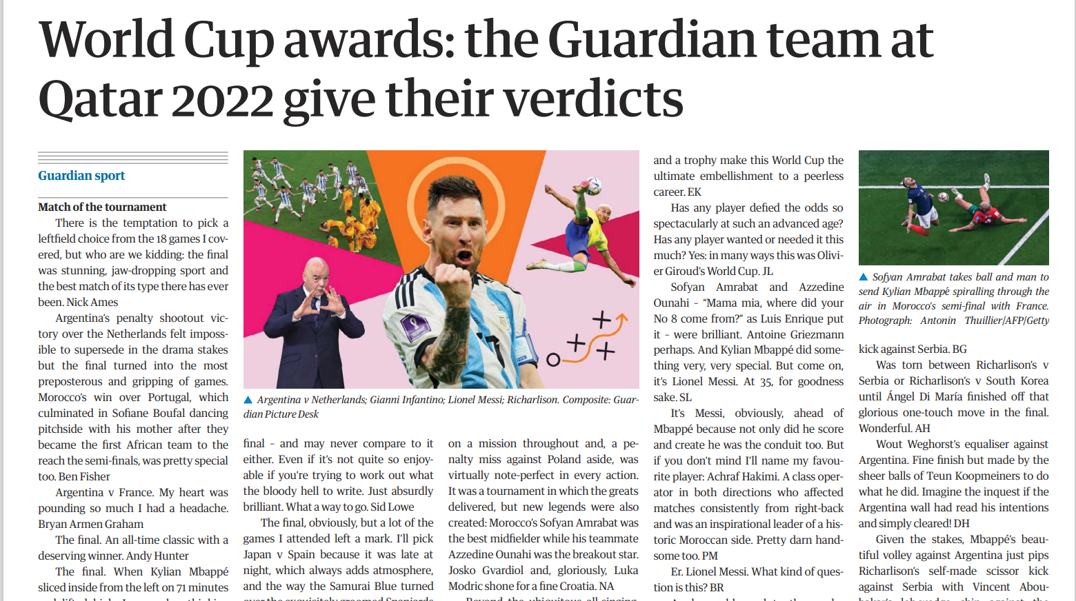 خصصت جريدة “الغارديان” البريطانية ملفا خاصا حول “جوائز كأس العالم: فريق الغارديان في قطر 2022 يصدر أحكامه”، وأثنت الجريدة على الأداء المتميز للمنتخب الوطني المغربي باحتلاله للرتبة الرابعة في كأس العالم لكرة القدم قطر2022.
