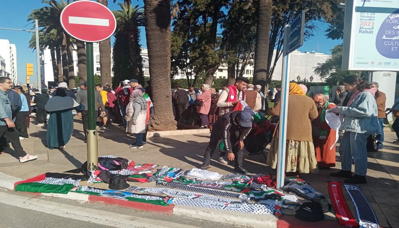 حضرت الكوفية الفلسطينية بقوة في مسيرة شعبية صباح اليوم الأحد 10 دجنبر 2023، وسط العاصمة المغربية الرباط.  ووثقت صور التقطها موقع “الإصلاح” الاقبال على شراء الكوفية والعلم الفلسطينيين على جنبات طول الخط الذي قطعته المسيرة انطلاقا من ساحة باب الحد بشارع الحسن الثاني في اتجاه البرلمان بشارع محمد الخامس.