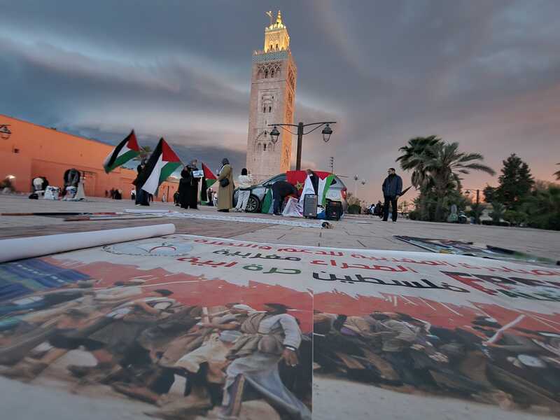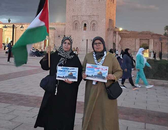 ورغم الأمطار العاصفية التي شهدتها مدينة مراكش، فقد كانت الوقفة معبرة ومتميزة، شارك فيها الرجال والنساء والشباب، والذين حجوا للساحة للتعبير عن تضامنهم مع الشعب الفلسطيني والتعبير عن دعمهم للمسجد الأقصى المبارك.