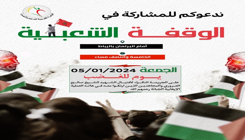 دعت المبادرة المغربية للدعم والنصرة عموم الشعب المغربي، وكل القوى المجتمعية المدنية والشبابية والنسائية والحقوقية والسياسية والنقابية وكل الأحرار إلى جعل الجمعة 05 يناير 2024، يوما للغضب على جريمة اغتيال الشهيد صالح العاروري والمجاهدين الذين ارتقوا معه.