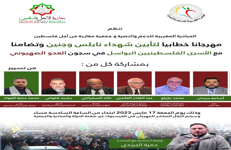 تنظم المبادرة المغربية للدعم والنصرة وجمعية مغاربة من أجل فلسطين مهرجانا خطابيا لتأبين شهداء نابلس وجنين، والتضامن مع الأسرى الفلسطينيين البواسل في سجون العدو الصهيوني.