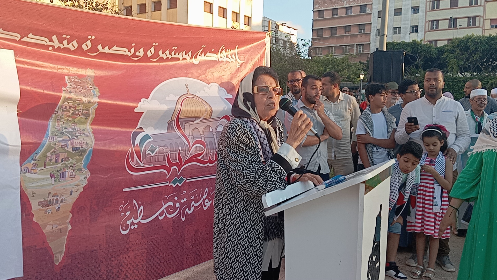 وتميزت الوقفة بمداخلة قوية لأيقونة الأدب والشاعرة والكاتبة  خناتة بنونة، عبرت فيها عن مجموعة من المواقف والتضحيات في سبيل القضية الفلسطينية من بيع أثاث منزلها، ودعم القضية الفلسطينية بالمال والقلم، وما تعرضت له من مضايقات وعراقيل من طرف الأمريكيين لأنها كانت تصف أمريكا ب”إسرائيل” الكبرى التي تحكمها إسرائيل الصغرى.