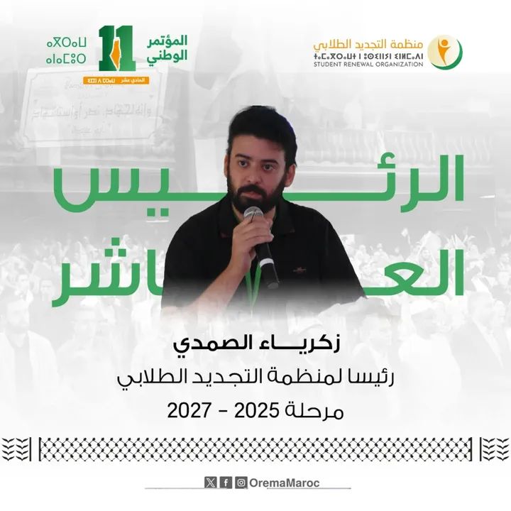 انتخب المؤتمر الوطني الحادي عشر لمنظمة التجديد الطلابي الأخ زكرياء الصمدي رئيسا لمنظمة التجديد الطلابي لمرحلة 2025 – 2027.