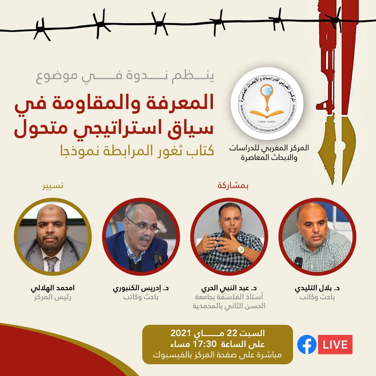ينظم المركز المغربي للدراسات والأبحاث المعاصرة مساء يوم السبت 22ماي 2021، ندوة تفاعلية في موضوع “المعرفة والمقاومة في سياق استراتيجي متحول: كتاب ثغور المرابطة نموذجا”.