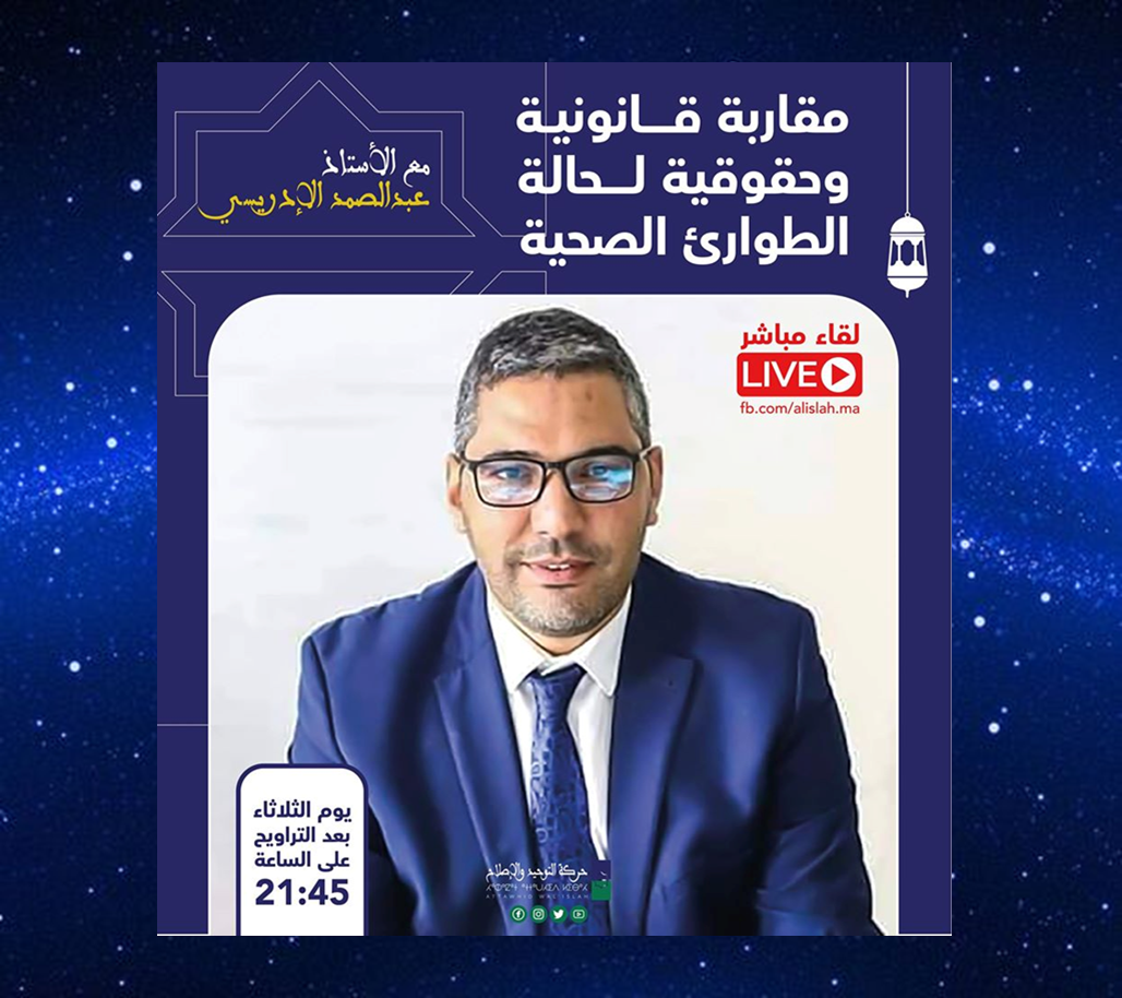 تستضيف حركة التوحيد والإصلاح، المحامي عبد الصمد الإدريسي؛ رئيس منتدى الكرامة لحقوق الإنسان، في إطار البرنامج الرمضاني، للحديث عن موضوع “مقاربة قانونية وحقوقية لحالة الطوارئ الصحية”.