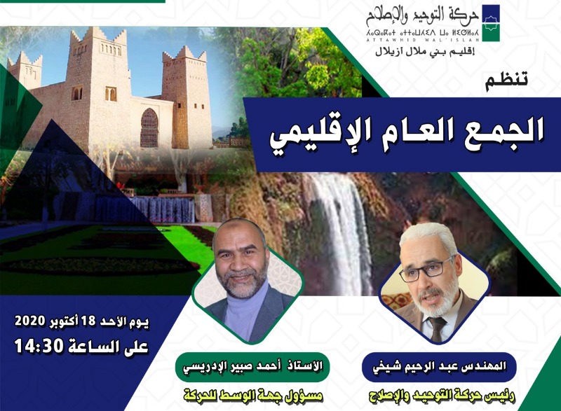 يعقد الفرع الإقليمي للحركة بني ملال أزيلال جمعه العام الإقليمي عن بعد، بمشاركة كل من الأستاذ عبد الرحيم شيخي رئيس حركة التوحيد والإصلاح والأستاذ أحمد صبير الادريسي مسؤول جهة الوسط، وذلك يوم الأحد 18 أكتوبر 2020 على الساعة الثانية والنصف زوالا (30 :14).