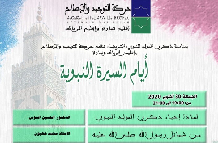 بمناسبة ذكرى المولد النبوي الشريف تنظم حركة التوحيد والإصلاح إقليمي الرباط وتمارة “أيام السيرة النبوية”، وذلك أيام 30 و31 أكتوبر، و01 نونبر 2020.
