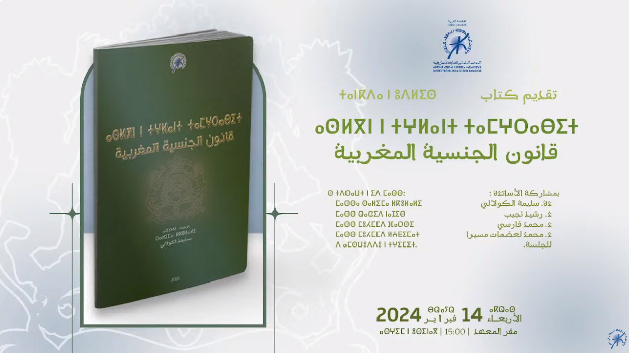 قدم المعهد الملكي للثقافة الأمازيغية الأربعاء الماضي بالرباط كتاب “قانون الجنسية المغربية” “ⴰⵙⵍⴳⵏ ⵏ ⵜⵖⵍⴰⵏⵜ ⵜⴰⵎⵖⵔⴰⴱⵉⵜ”، الذي تمت ترجمته من اللغة العربية إلى الأمازيغية.