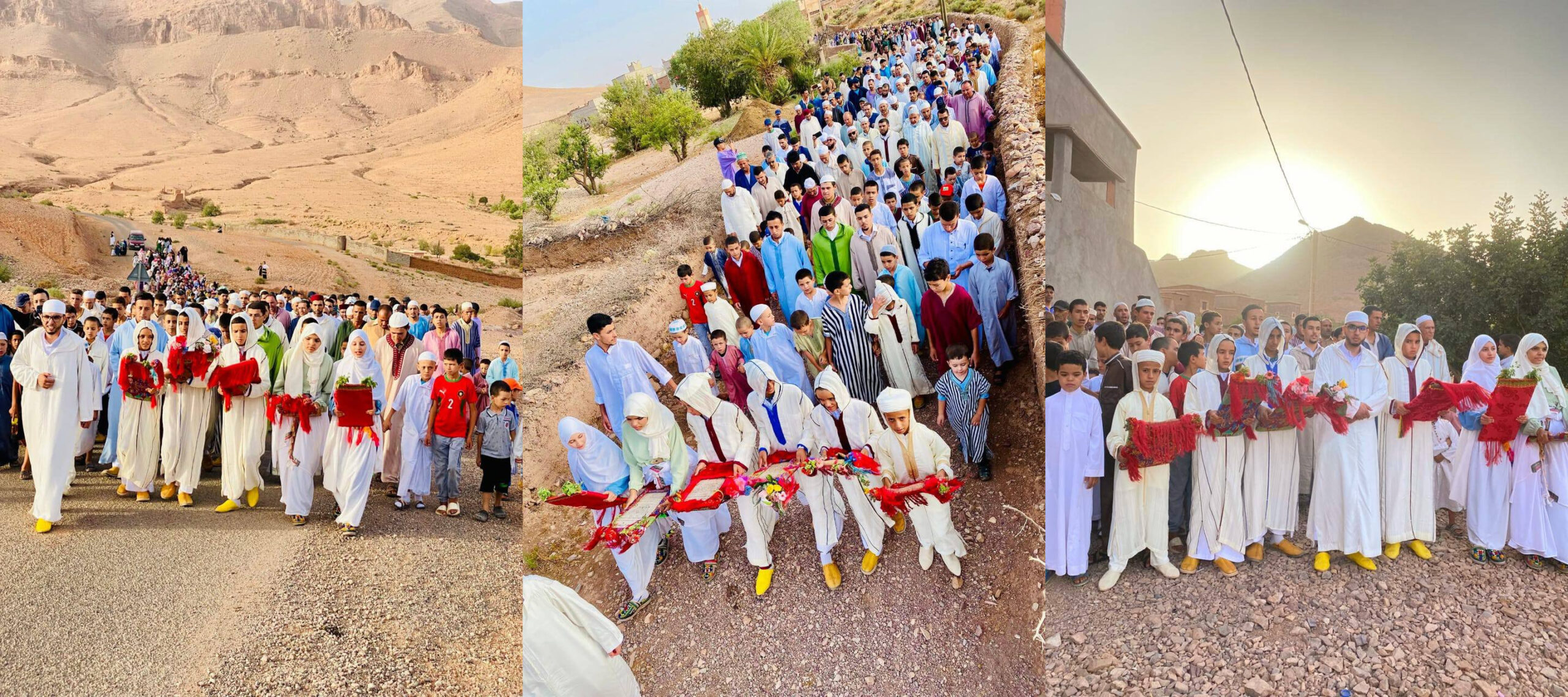 وأظهرت صور الحفل موكبا قرآنيا كبيرا يجوب شارعا رئيسيا وسط جبال المنطقة وواحتها، ويحمل ختمة كتاب الله الألواح المزركشة بالألوان والورود، ويرتدون الملابس التقليدية الأمازيغية المغربية وأمامهم معلموهم.