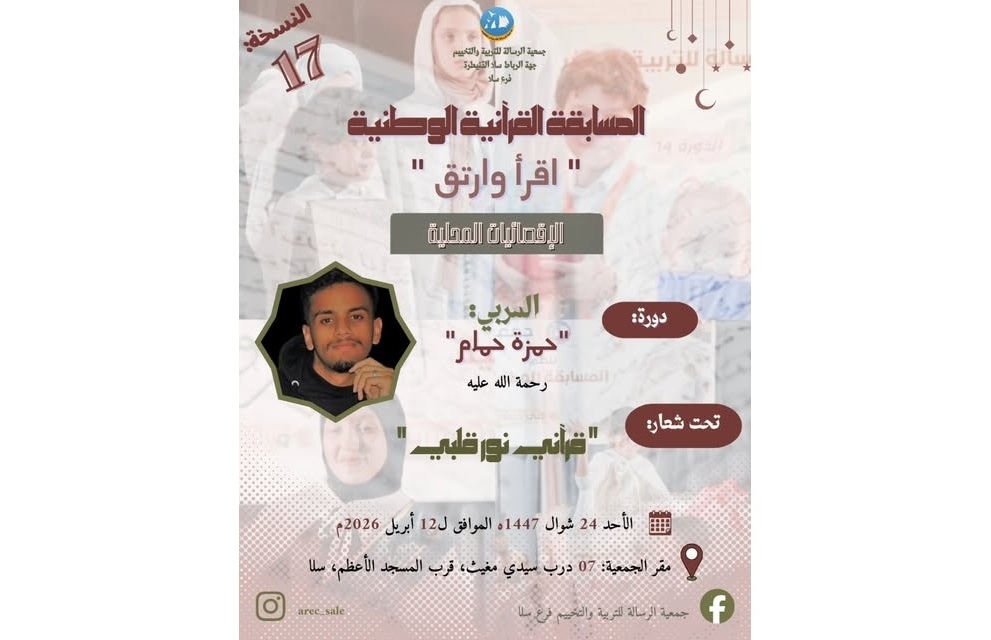 تنظم جمعية الرسالة للتربية والتخييم فرع سلا الإقصائيات المحلية للمسابقة القرآنية الوطنية في نسختها الـ17 “اقرأ وارتق”، دورة المربي “حمزة حمام” تحت شعار : “قرآني نور قلبي” يوم الأحد 12 أبريل 2026 بمقر الجمعية قرب المسجد الأعظم بمدينة سلا.