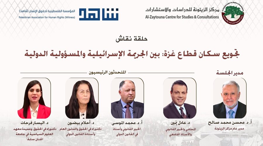 جاء ذلك في ختام ندوة افتراضية نظّمها مركز الزيتونة للدراسات والاستشارات بالتعاون مع مؤسسة شاهد لحقوق الإنسان والديمقراطية الأربعاء الماضي بعنوان: “تجويع سكان قطاع غزة: بين الجريمة الإسرائيلية والمسؤولية الدولية”، شارك فيها نخبة من الخبراء القانونيين والأكاديميين.