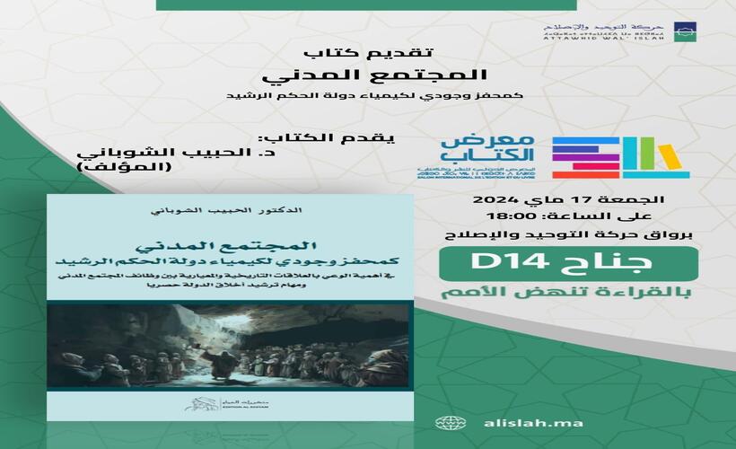 ينظم برواق حركة التوحيد والإصلاح بالمعرض الدولي للنشر والكتاب جناح D14، تقديم كتاب “المجتمع المدني كمحفز وجودي لكيمياء الحكم الرشيد”، لمؤلفه الدكتور الحبيب الشوباني، وذلك يومه الجمعة 17 ماي 2024، على الساعة السادسة مساء.