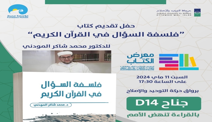 يحتضن رواق حركة التوحيد والإصلاح بالمعرض الدولي للنشر والكتاب D14 مساء اليوم السبت 11 ماي 2024  توقيع كتاب “فلسفة السؤال في القرآن الكريم” للدكتور محمد شاكر المودني على الساعة الخامسة والنصف عصرا (17.30).