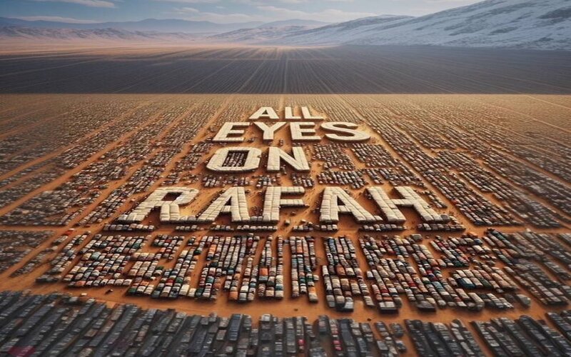 وبدأت الحملة بصورة تبرز مشهدا من الأعلى لاكتظاظ المدينة بمخيمات النازحين العزّل في بقعة جغرافية محدودة، وكتب عبارة “ALL EYES ON RAFAH “ “كل العيون على رفح” باستخدام خيم بيضاء وسط المشهد.
