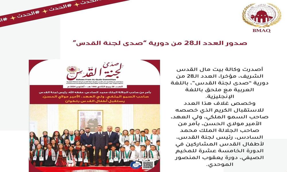 ويتضمن العدد، علاوة على الأبواب الثابتة في أعداد الدورية، ملفا عن الدخول الاقتصادي والاجتماعي الصعب في القدس، جراء الأحداث التي تتأثر بها المدينة، كما تضمن ردود الفعل الدولية المرحبة بمبادرات الملك محمد السادس، والأعمال المقدرة لوكالة بيت مال القدس الشريف، الذراع التنفيذية للجنة القدس، في دعم القدس وسكانها.