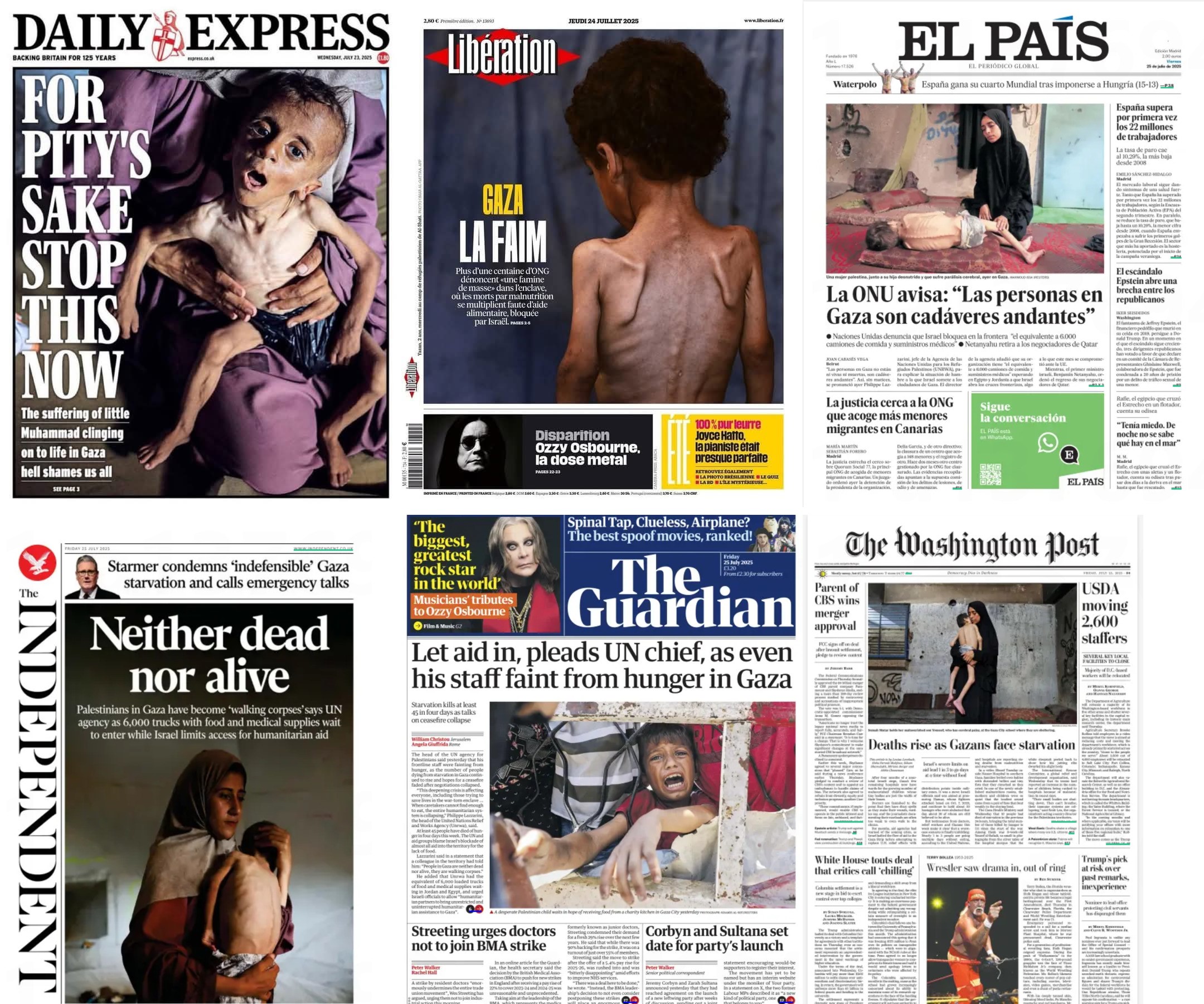 تصدرت صور المجاعة التي تعصف بقطاع غزة واجهة بعض الصحف العالمية المشهورة، التي ألف بعضها التحريض ضد الفلسطينيين في انحياز أبدي للرواية الصهيونية منذ قيام كيان الاحتلال على أرض فلسطنين.