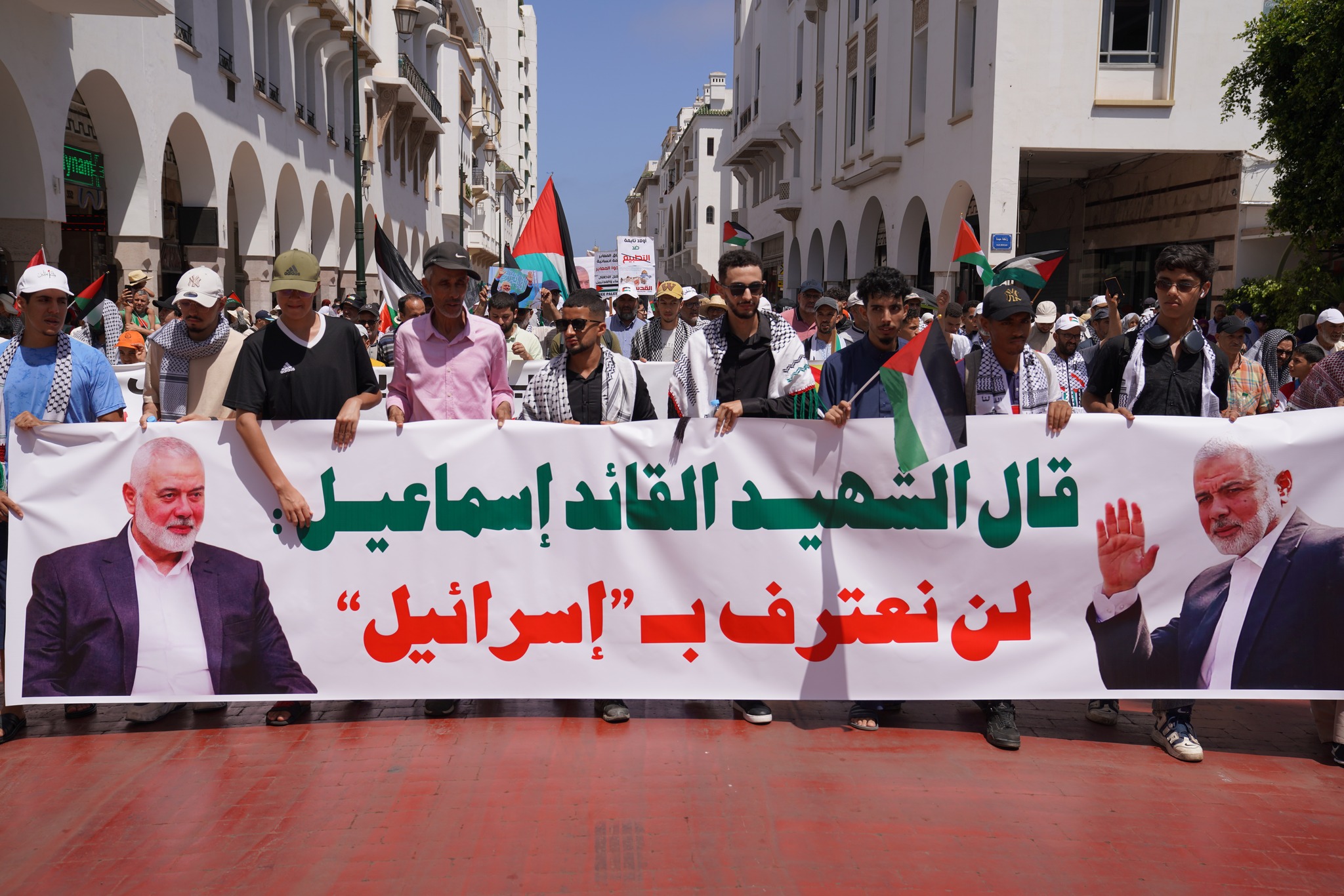 وردد المشاركون في الوقفة شعارات على رأسها مقولة الشهيد إسماعيل هنية “لن نعترف بإسرائيل”، و”الشعب يريد إسقاط التطبيع”. كما حملوا صور الشهيد والأعلام الفلسطينية والمغربية، وصور الشهداء القادة، والمسجد الأقصى.