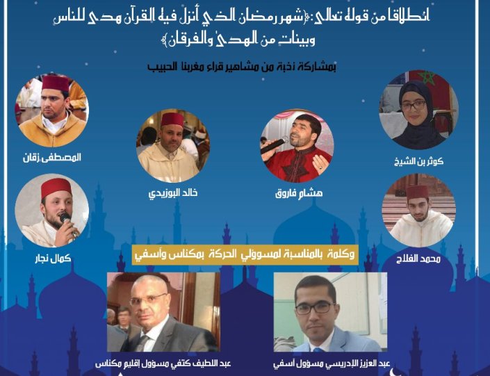 انطلاقا من قوله تعالى:” شهر رمضان الذين أنزل فيه القران هدى للناس وبينات من الهدى والفرقان”، ينظم الفرع الإقليمي للحركة بمدينتي مكناس وأسفي أمسية قرآنية بمشاركة نخبة من مشاهير قراء المغرب، كما ستعرف الأمسية كلمة بالمناسبة لمسؤولي الحركة بالمدينتين الأستاذ عبد العزيز الإدريسي والأستاذ عبد اللطيف كتفي.