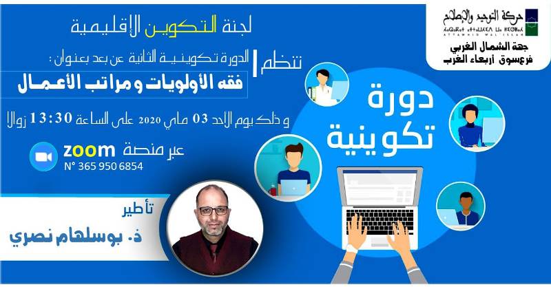 ألقى ذ. بوسلهام نصري مسؤول الدعوة بالإقليم، والمكوّن المتدرب ضمن الفوج الثاني الذي تسهر الحركة وطنيا على تأهيله، عرضا في موضوع “فقه الأولويات ومراتب الأعمال”، خلال الدورة التكوينية الثانية التي نظمها فرع سوق الأربعاء – بلقصيري يوم الأحد 09 رمضان 1441 الموافق ل 03 ماي 2020، باستعمال تقنية التواصل عن بعد Zoom.