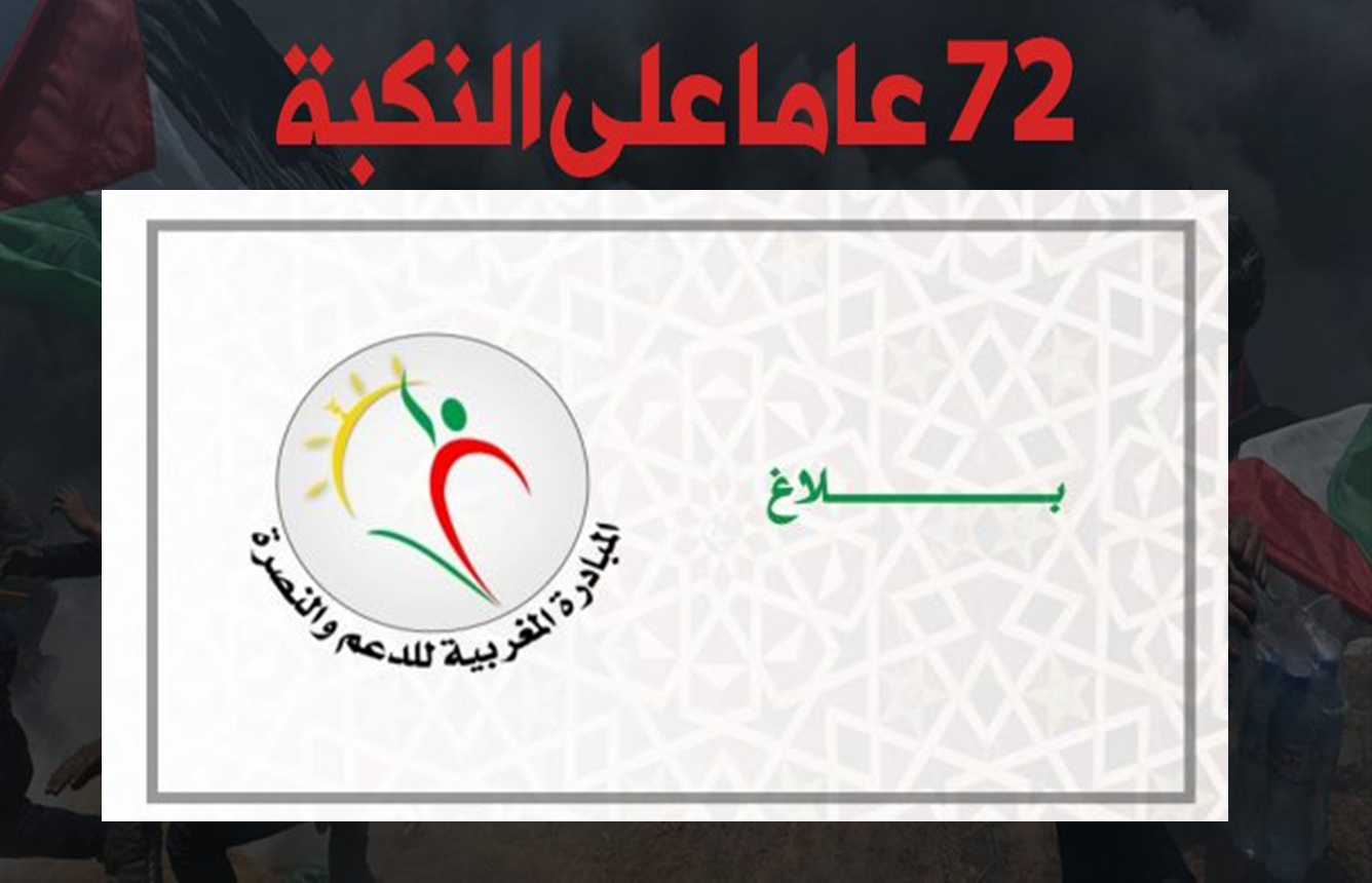 أصدرت المبادرة المغربية للدعم والنصرة بلاغا بمناسبة تخليد الذكرى 72 لنكبة فلسطين تحت شعار “فلسطين…. قضيتي”.