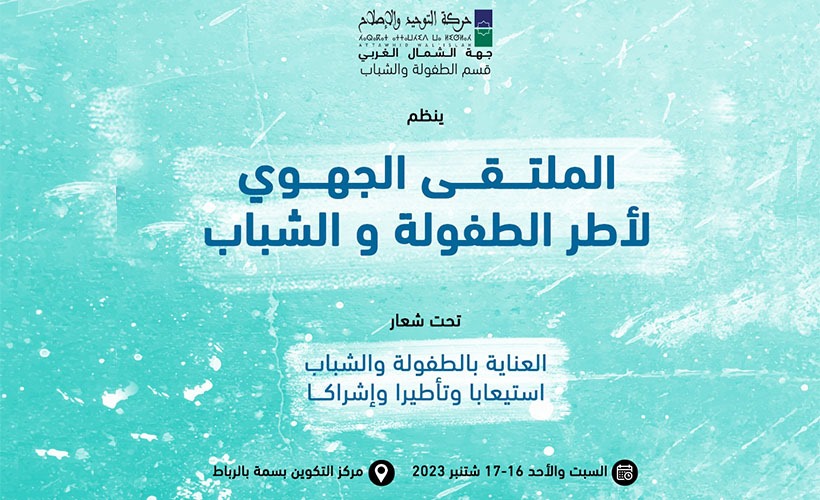 ينظم قسم الطفولة والشباب لجهة الشمال الغربي الملتقى الجهوي لأطر الطفولة والشباب تحت شعار: “العناية بالطفولة والشباب استيعابا وتأطيرا وإشراكا”، وذلك يومي  16 و 17 شتنبر 2023 بمركز التكوين بسمة بالرباط.